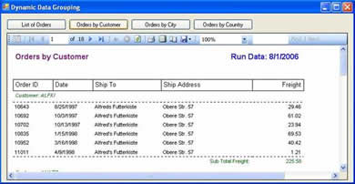 Let us discuss a practical scenario here. If I ask you, what kind of output you see in (image 1.0); you would probably say a simple report listing orders information. Well, you guessed it right. What will you do if the end-users want same report using data grouped by CustomerID(image 1.1)? In most cases, you might end up writing a new report. In this article, I will demonstrate how to reuse the report to produce the demanded output without the need of writing a new report.