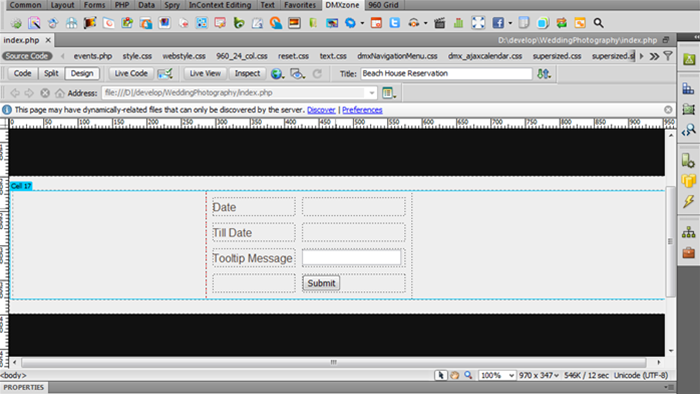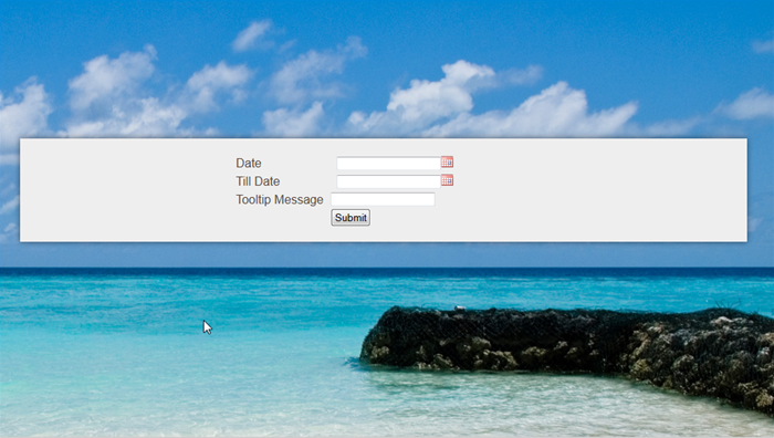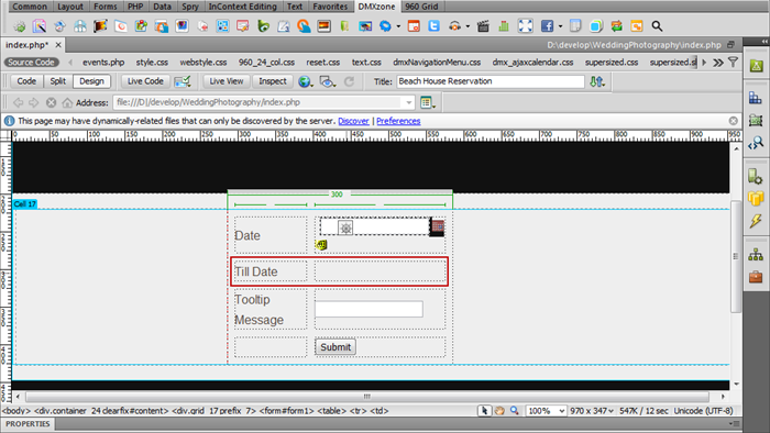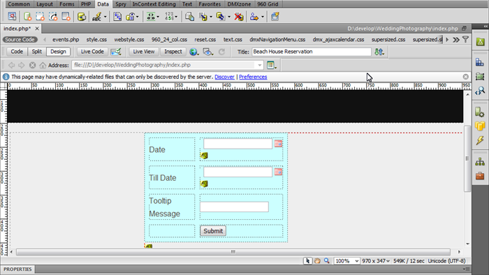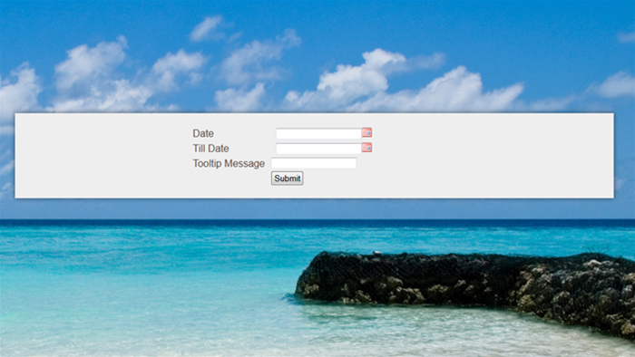 - We've already created our website layout and are going to insert Date, Till date and Tooltip message in our database. We will use DMXzone Calendar 2 as datapicker for Date and Till date.
