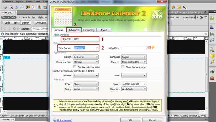- In the DMXzone Calendar 2 window, enter an ID for the calendar (1), choose a date format that will be used on the page (2) and click the advanced button (3).