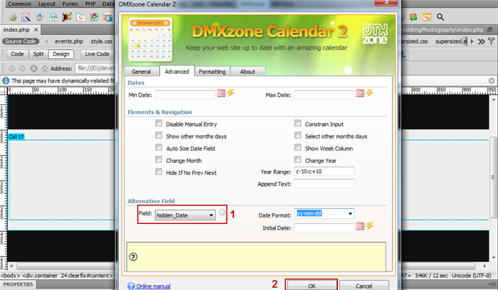 - Click the Add new hidden field button (1). The ID of the hidden field is the same as the calendar's ID with a prefix "hidden". When you're done, click OK (2).