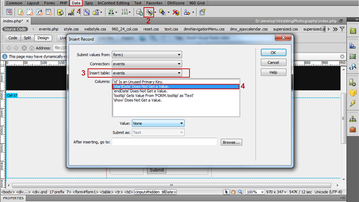- Click the Data tab (1), select the Insert record icon (2), select your database table (3) and select the column that stores your Date (4).