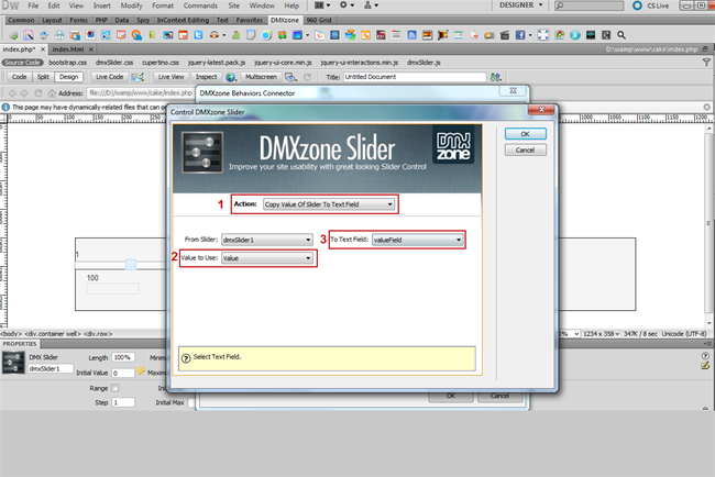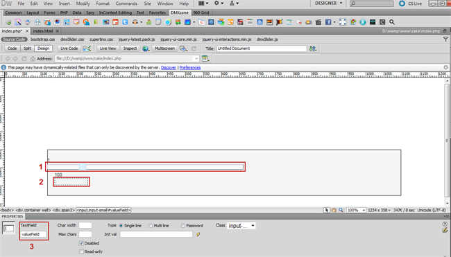 - We've already inserted the DMXzone Slider (1) on our page, added a standard Text field (2) and named its ID: valueField (3).