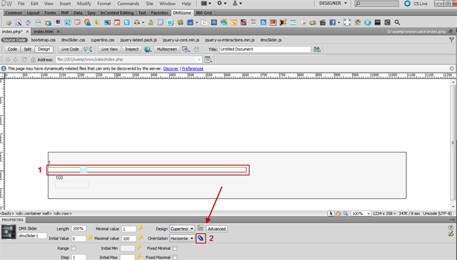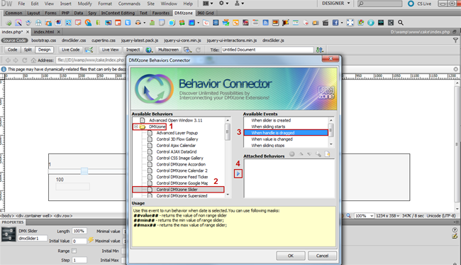 - In order to bind the Text field and the DMXzone Slider we'll need to use the Behavior connector. So, click on the DMXzone Slider (1) and then click the Add/edit behaviors button (2) in the property inspector.