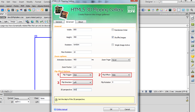 - For our showcase we want the flip effect to be executed on mouse click (1) with a slide effect (2), flipping direction: left (3). We leave the rotation angle and the 3D perspective values by default. When you're done, click the OK button.
