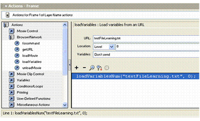 tells Macromedia Flash MX to look for textFileLearning.txt and to load